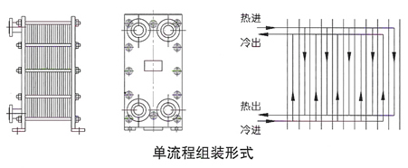 板式換熱器根據(jù)介質(zhì)的溫差和流量,可以裝配成單流程、雙流程、三流程以及多流程的形式。單流程是指介質(zhì)在換熱器內(nèi)流過一個流程,雙流程是指介質(zhì)在換熱器內(nèi)折返流過兩個過程,依次類推,各種流程的外形圖和其流程示意圖如圖3。當(dāng)采用多流程時,換熱器的四個接口就不能在同一側(cè)的夾緊板上,進(jìn)出口要位于前后兩個夾緊板上。