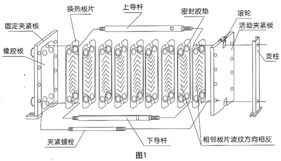 板式換熱器的結(jié)構(gòu)分解如圖1,產(chǎn)品外型如圖2,主要部件是由換熱板片、密封膠墊、夾緊板、導(dǎo)桿、夾緊螺栓組成。換熱板片是由不銹鋼板壓制成型,它上面開有4個流道孔,中部壓成人字形波紋,四周壓有密封槽。密封槽內(nèi)粘有密封膠墊。換熱板片通過兩導(dǎo)桿定位對齊,兩夾緊板通過夾緊螺栓將各板片壓緊,從而形成換熱器內(nèi)腔換熱流道。相鄰換熱板片的人字形波紋方向安裝時相反,接觸點(diǎn)彼此相互支撐。人字形波紋和這些支撐點(diǎn)使流體介質(zhì)在其內(nèi)部流動時充分形成湍流,這是板式換熱器具有很高換熱效率的主要原因。另外換熱板片厚度較薄,導(dǎo)熱熱阻較小,板片兩側(cè)的流體介質(zhì)流動分布較為均衡,也使得傳熱較為充分。