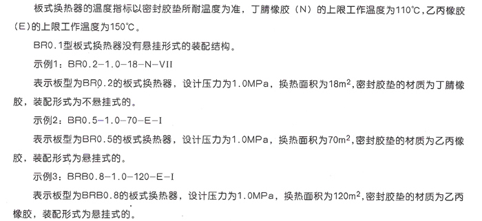 BRMO.0是指單片換熱板片的有效換熱面積為0.g平方米,其它型號的意義相同。選擇某種型號采用不同數(shù)量的換熱板片就可組裝成所需換熱面積的換熱器。